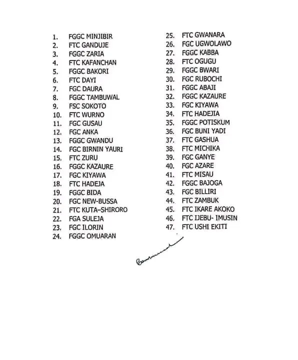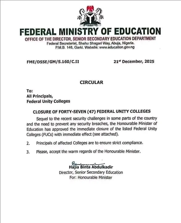 The Federal Ministry of Education issued a circular directing the immediate closure of 47 Federal Unity Colleges nationwide. The Ministry mentioned the recent security challenges and the need to prevent any security breaches, as the reason for the drastic action. Affected schools include institutions in Zaria, Sokoto, Potiskum, and Abaji and others.